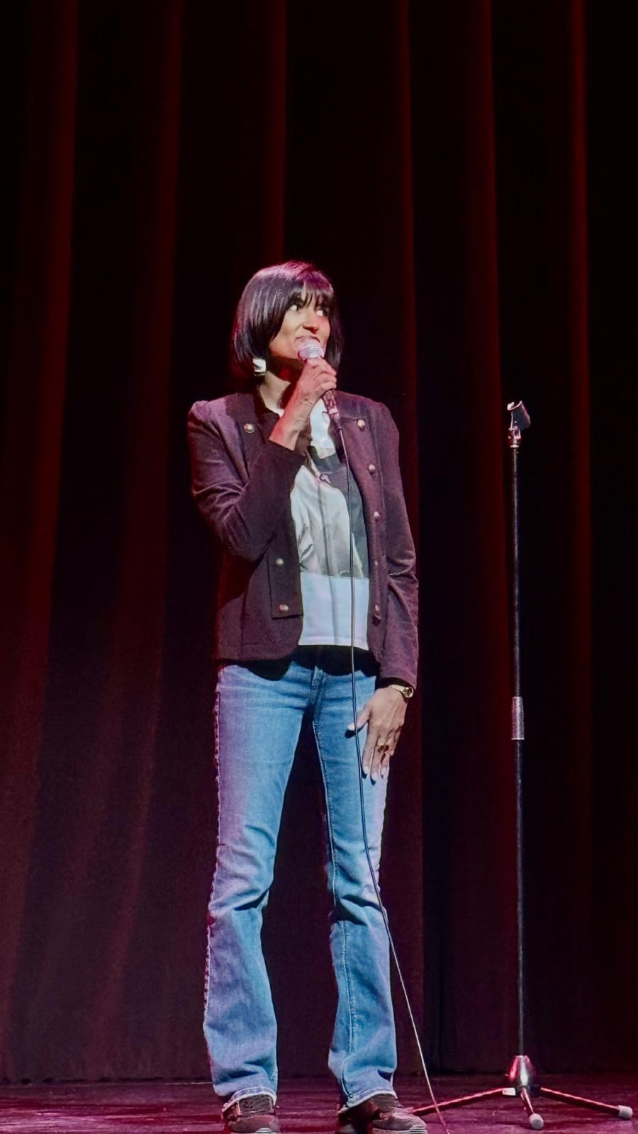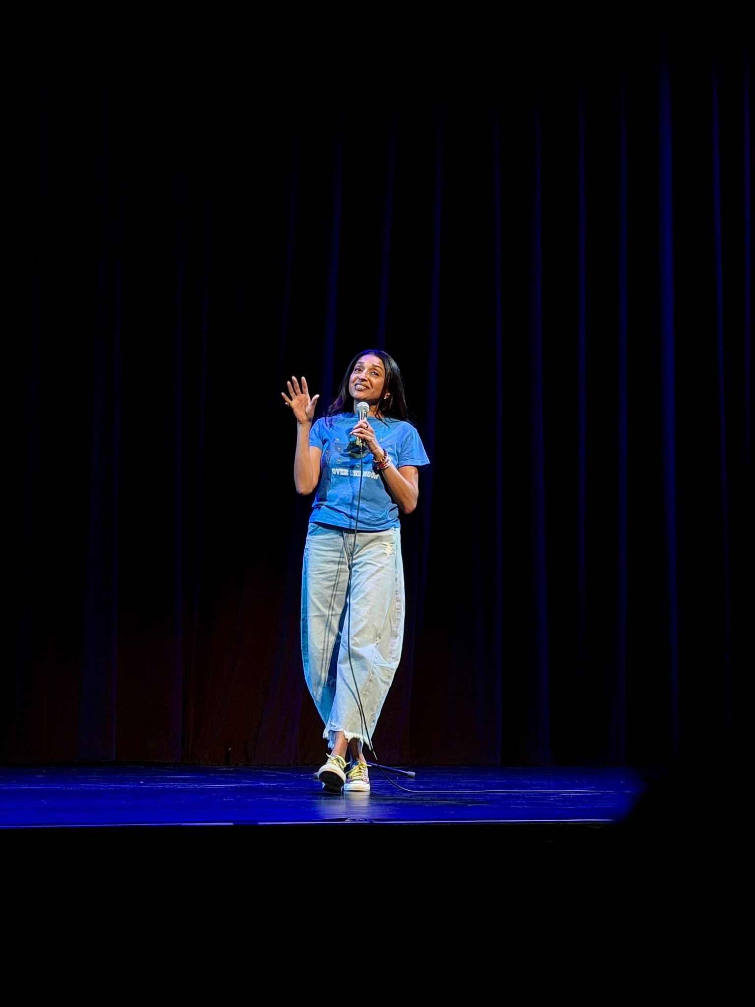 In better news, the Womanosphere is a beautiful place to be!! This past weekend I opened for British comedian Sindhu Vee, and she is a classic example of a positive, kind, and compassionate influencer! She has close to a million followers on influencer, and all of her videos have loads and loads of positive comments. Speaking to her backstage, I basked in her warm presence, as she gave me tips on how to survive as an above-40 woman in comedy and shared a story about how she bombed in Southall in London (can’t imagine her bombing) to a fully desi crowd. She said that you gotta do it for the love it, not to become famous or even to help people. We were deep in conversation when the production manager walked in and said, “Mita, you’re on in 5 minutes!” Ahhhhhh!! So I stood behind the curtain and took a deep breath, with the intention to truly be there and experience the magnitude of the moment. What a thrill it was to share my story, make people laugh, and warm up the crowd for Sindhu.
